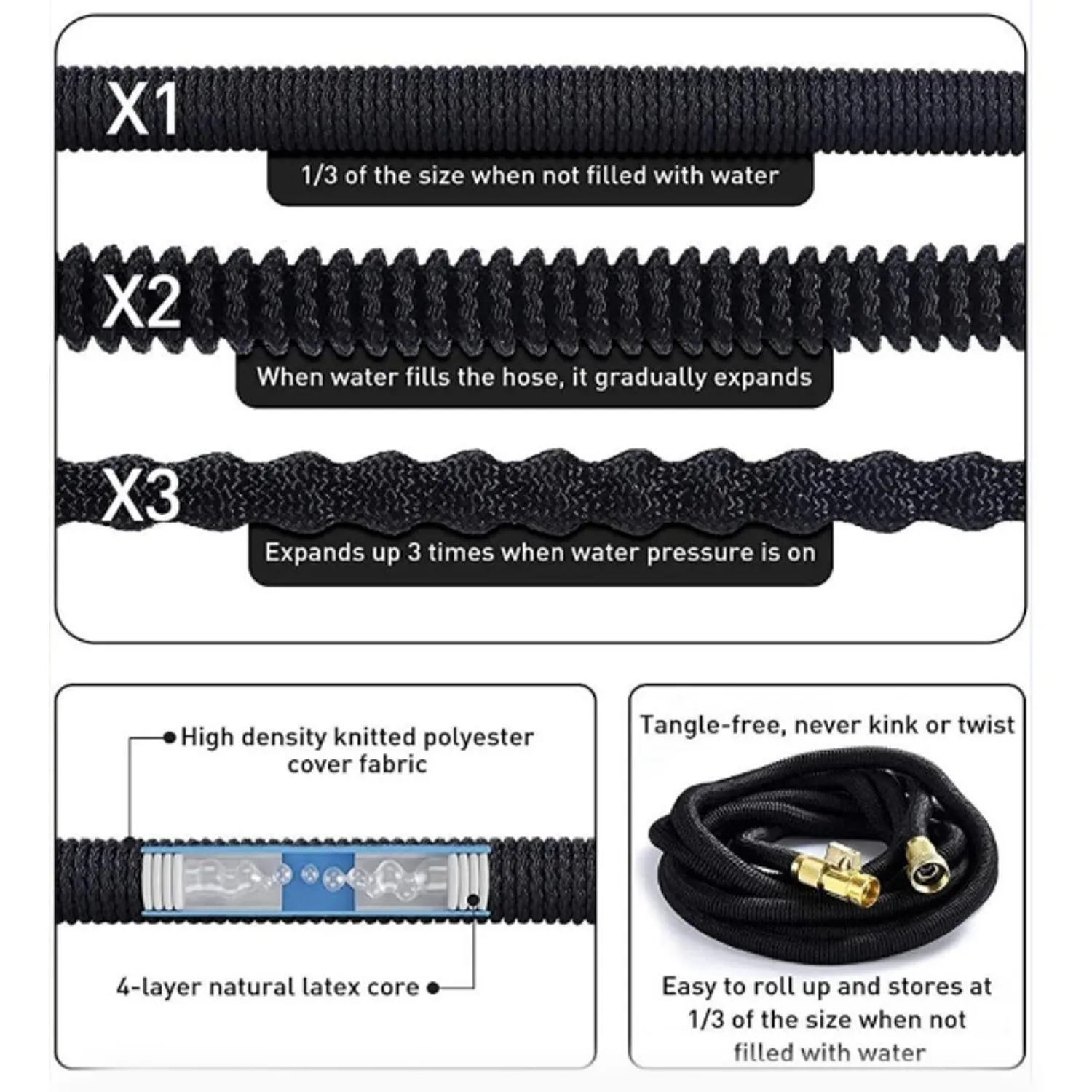 - Durable High-Pressure Core + Reinforced Fabric – Withstands strong water pressure, reducing bursts and lasting longer.