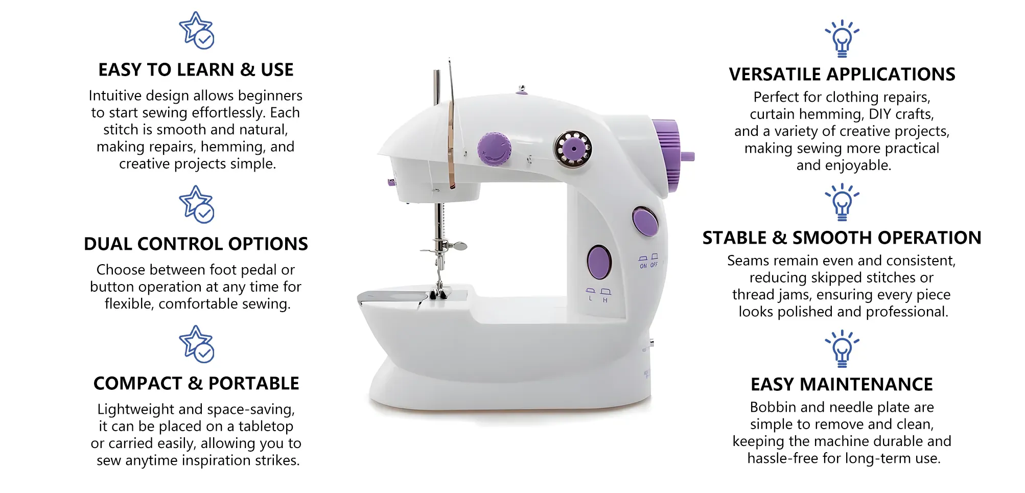 - Two-Speed Settings - Low speed for better control, high speed for faster and more efficient sewing.