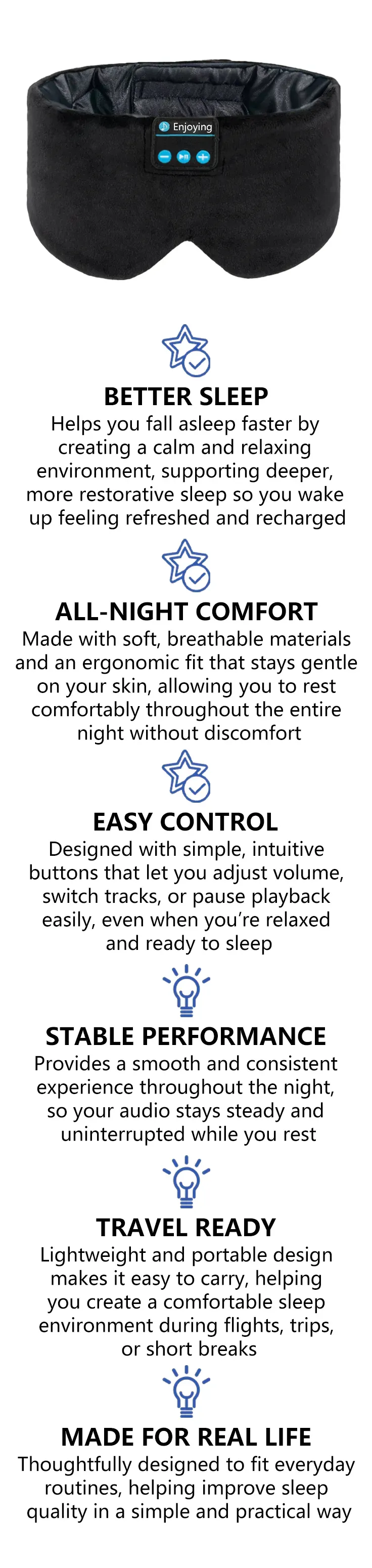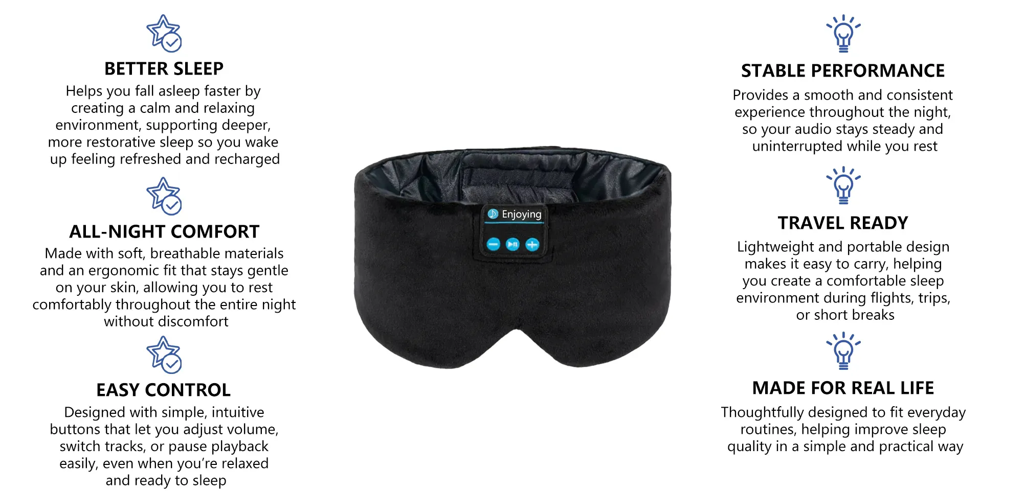 Tossing and turning, distracted by noise or unable to relax your mind can make falling asleep feel frustrating. This sleep mask creates a calm, immersive environment with soothing audio and gentle comfort, helping you unwind, block out distractions, and ease into a deeper, more restful sleep.